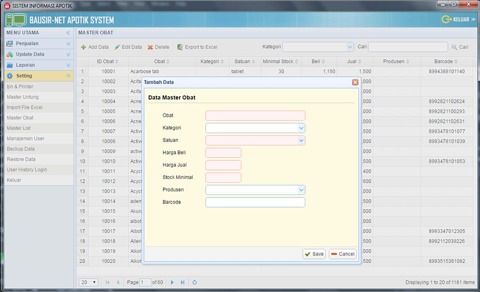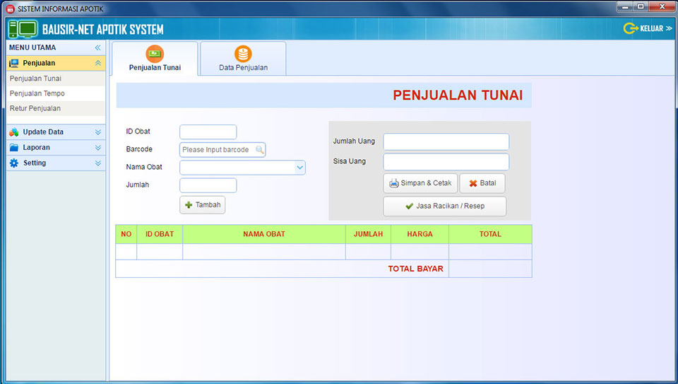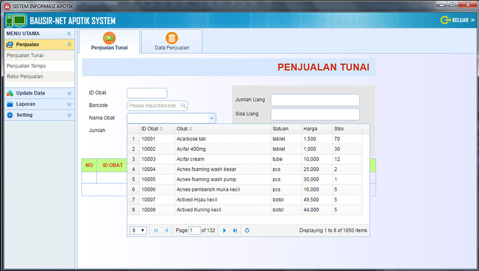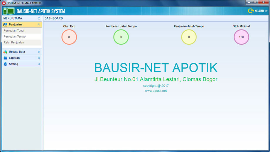 Software Bausir-Net Apotik adalah aplikasi untuk mengelola penjualan obat di apotek, depo farmasi atau toko obat biasa, mempunyai fitur yang sangat lengkap dengan harga yang terjangkau, dengan menggunakan software apotik ini anda tidak perlu repot dalam melakukan transaksi di apotik atau toko obat anda, semuanya menjadi lebih mudah